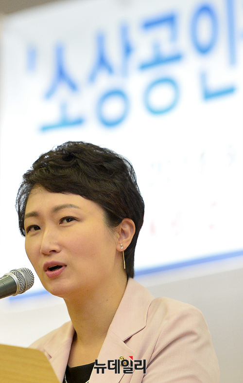 이언주 바른미래당 의원이 13일 오전 국회 도서관에서 열린 '소상공인을 위한 생계형 적합업종제도의 합리적 설계방향' 세미나에 참석해 축사를 하고 있다.