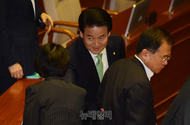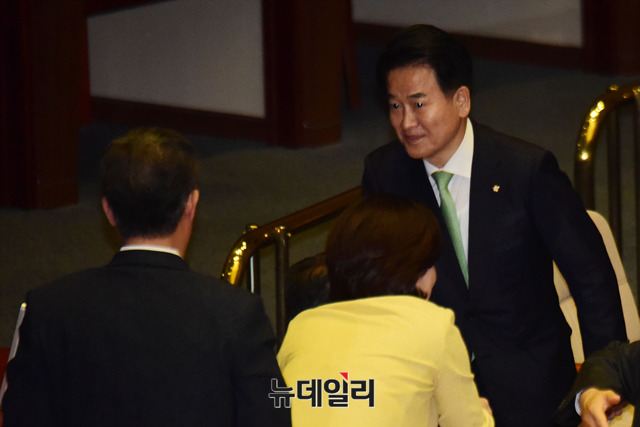 정동영 민주평화당 대표가 13일 오전 국회에서 열린 본회의에서 비교섭단체 대표발언을 마치고 의원들과 인사를 나누고 있다.