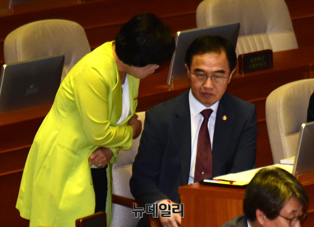 조명균 통일부 장관과 조배숙 민주평화당 의원이 13일 오전 국회에서 열린 본회의에서 대화를 나누고 있다.