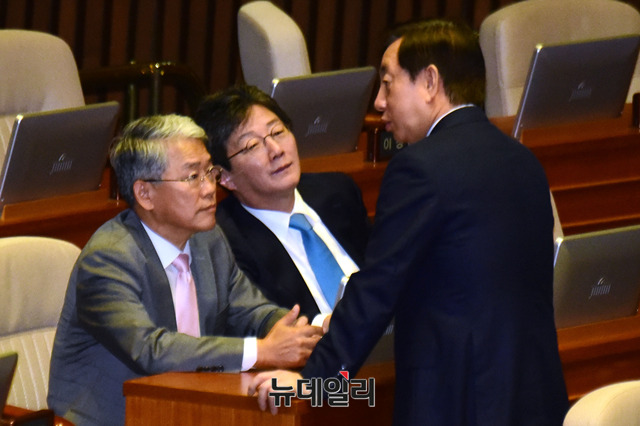 김성태 자유한국당 원내대표가 13일 오전 국회에서 열린 본회의에서 김동철, 유승민 바른미래당 전 대표와 이야기를 나누고 있다.