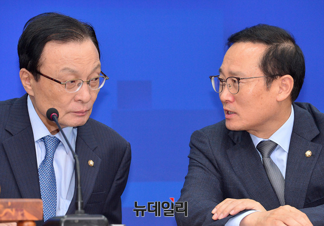 이해찬 더불어민주당 대표와 홍영표 원내대표가 17일 오전 국회에서 열린 최고위원회의에 참석해 대화를 나누고 있다.
