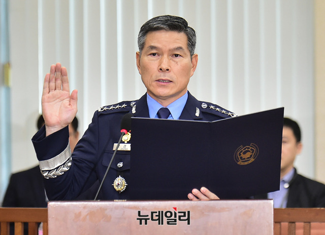 정경두 국방부장관 후보자가 17일 오전 국회에서 열린 인사청문회에 출석해 선서를 하고 있다.