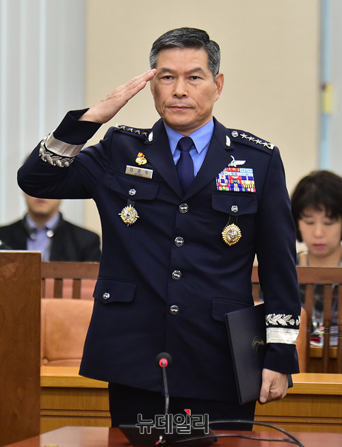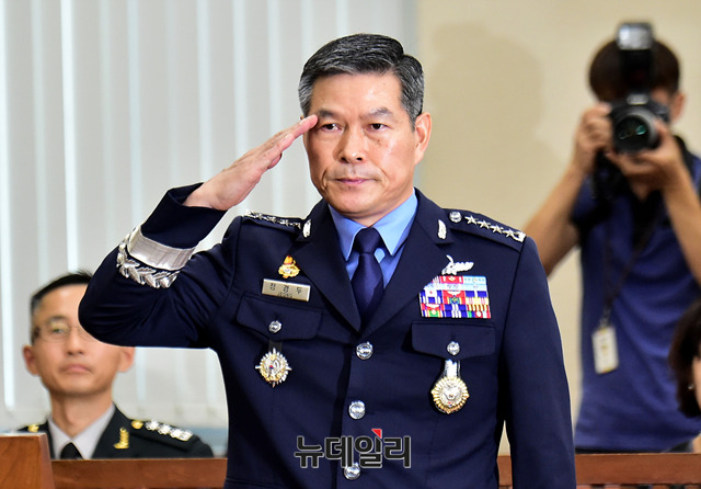 정경두 국방부장관 후보자가 17일 오전 국회에서 열린 인사청문회에 출석해 거수경례를 하고 있다.