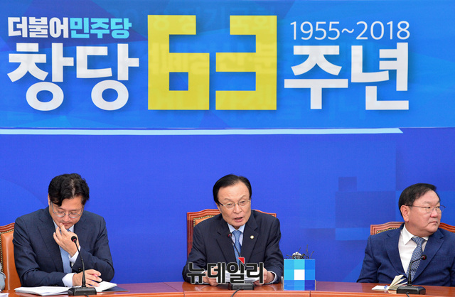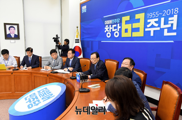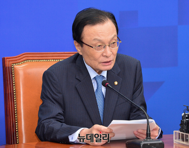 이해찬 더불어민주당 대표가 17일 오전 국회에서 열린 기자간담회에 참석해 모두발언 하고 있다.