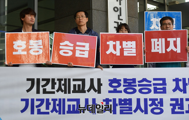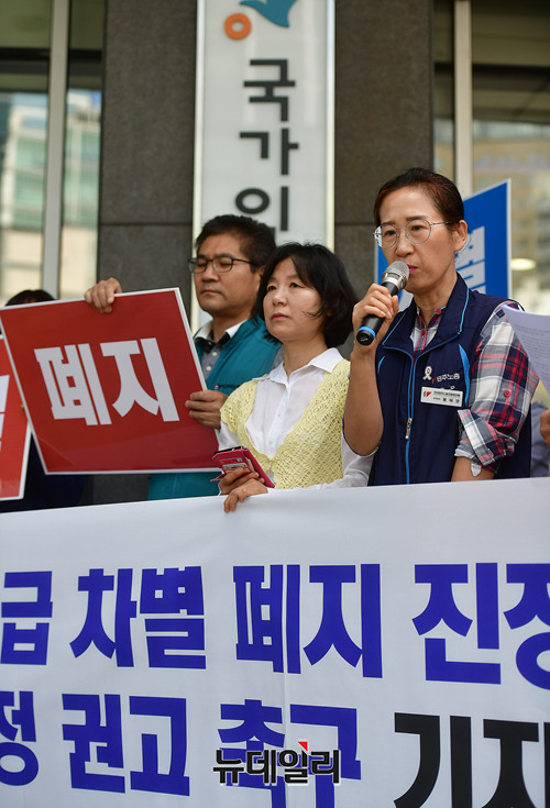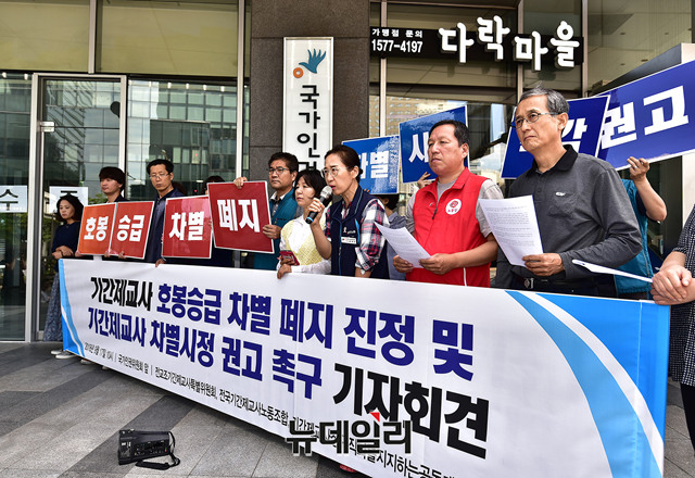 전교조가 17일 오전 서울 중구 국가인권위원회 앞에서 '기간제교사 차별 시정 권고'를 촉구하는 기자회견을 열고 있다.