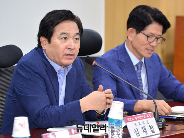 심재철 전 국회부의장이 17일 오후 국회 의원회관에서 열린 '한반도 종전선언의 함정 : 종전선언인가, 전쟁선언인가!' 토론회에 참석해 축사를 하고 있다.