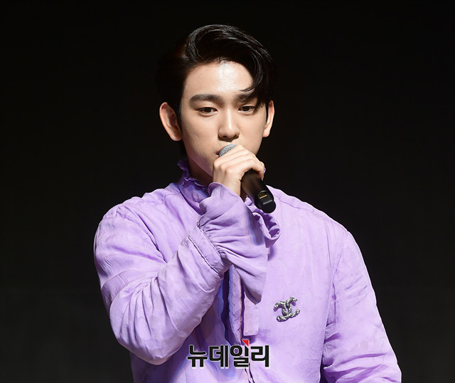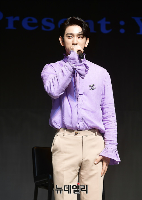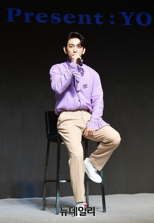 아이돌그룹 'GOT7(갓세븐)' 진영이 17일 오후 서울 서초구 JW메리어트호텔서울에서 정규 3집 앨범 'Present : YOU(프리젠트 유)' 제작발표회에서 수록곡을 소개하고 있다.