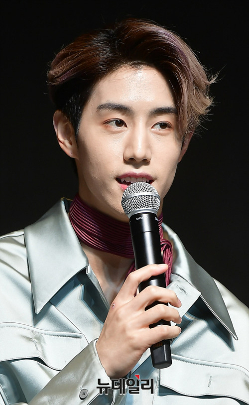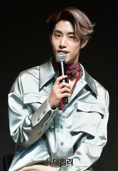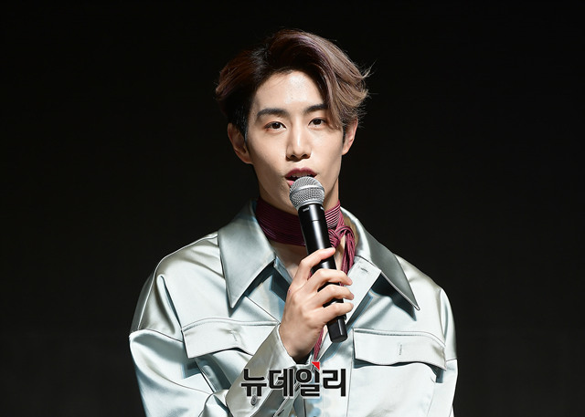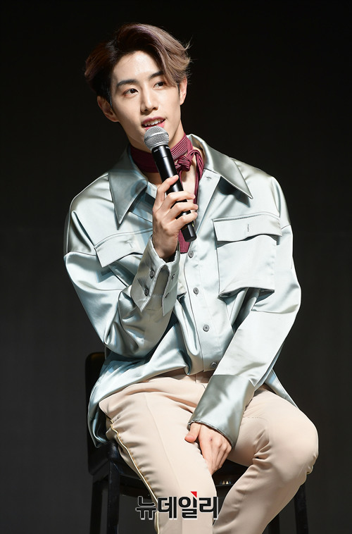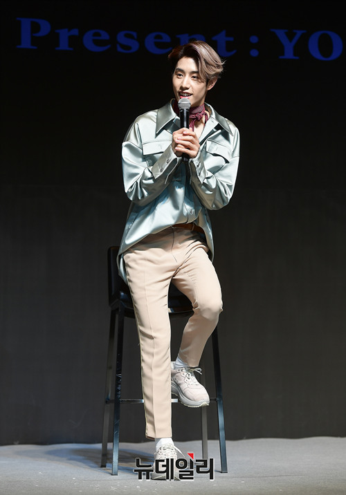 아이돌그룹 'GOT7(갓세븐)' 마크가 17일 오후 서울 서초구 JW메리어트호텔서울에서 정규 3집 앨범 'Present : YOU(프리젠트 유)' 제작발표회에서 수록곡을 소개하고 있다.