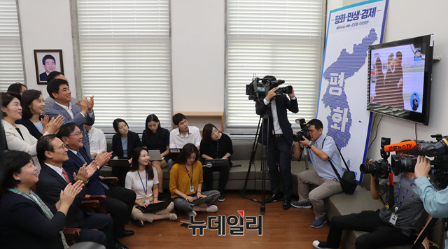 홍영표 더불어민주당 원내대표와 의원, 당직자들이 18일 오전 국회에서 문재인 대통령 평양 순안공항 도착 장면 중계를 시청하며 박수치고 있다.
