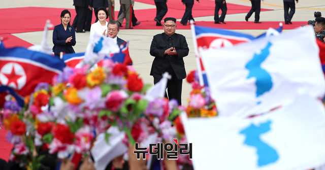 2018 남북정상회담을 위해 18일 오전 평양 순안공항에 도착한 문재인 대통령과 김정숙 여사가 공식환영식에서 김정은 국무위원장, 리설주 여사와 함께 평양시민들의 환영을 받고 있다. (사진=평양사진공동취재단)