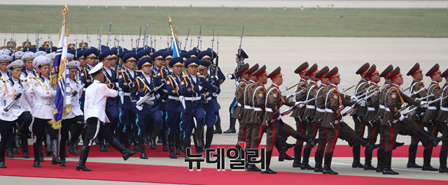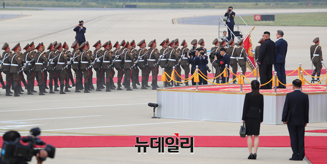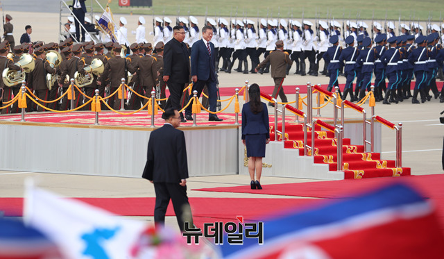2018 남북정상회담을 위해 18일 오전 평양 순안공항에 도착한 문재인 대통령이 김정은 국무위원장과 함께 의장대를 사열하고 있다.(사진=평양사진공동취재단)