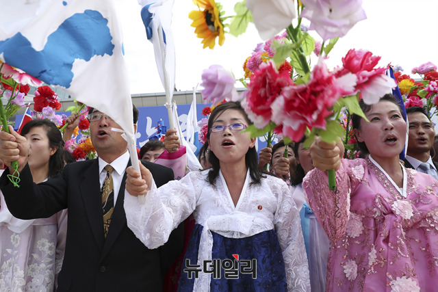 [포토] 문 대통령 일행 환영하는 평양 시민들