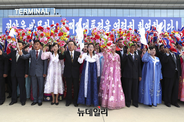 평양 시민들이 18일 평양 순안공항에서 문재인 대통령 일행을 환영하고 있다. (평양사진공동취재단)