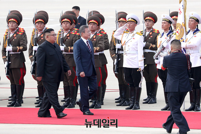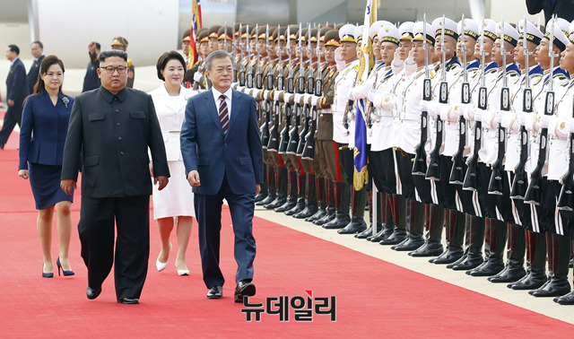 문재인 대통령과 부인 김정숙 여사가 18일 오전 평양 순안공항 도착한 뒤 마중 나온 김정은 국무위원장과 부인 리설주 여사와 함께 북한군 의장대 사열을 받고 있다. (사진=평양사진공동취재단)