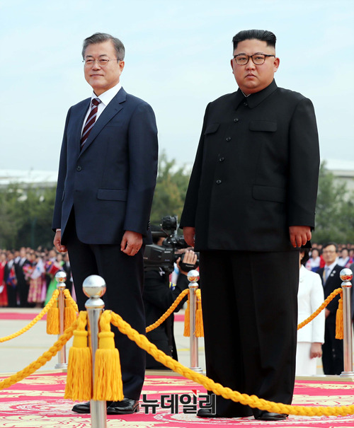 문재인 대통령이 18일 오전 평양 순안공항 도착한 뒤 마중 나온 김정은 국무위원장과 북한군 의장대를 사열하고 있다. (사진=평양사진공동취재단)