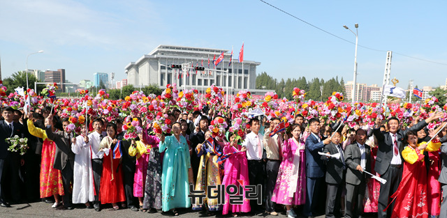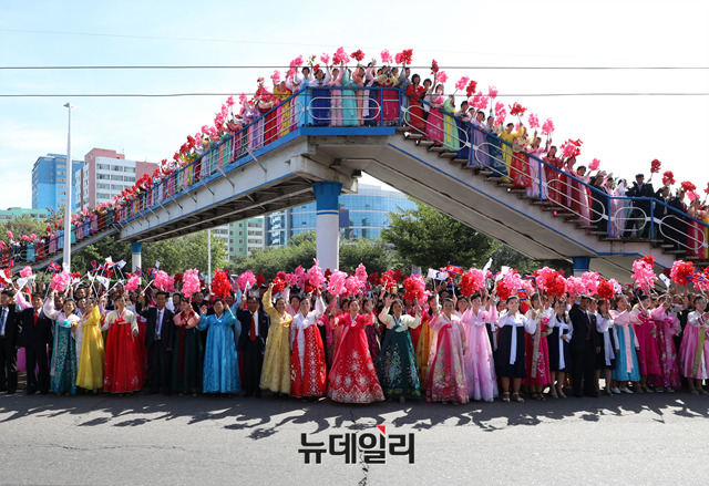 18일 평양 순안공항에서 평양시내로 향하는 거리에 시민들이 꽃을 흔들며 문재인 대통령을 환영하고 있다. (사진=평양사진공동취재단)