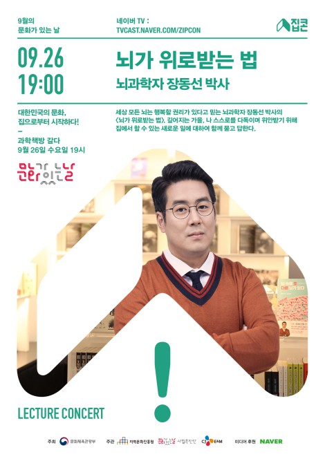 뇌과학자 장동선 박사가 9월 '집콘'의 주인공으로 나선다.매달 마지막 수요일 '문화가 있는 날'에 열리는 '집콘'은 '집에서 펼쳐지는 콘서트' 또는 '문화를 집(集)하다'라는 의미다. 집이나 일상 공간 가까이에서 문화를 즐기자는 취지로 시작된 캠페인이다.장동선 박사는 오는 26일 오후 7시 삼청동에 위치한 '과학책방 갈다'에서 '뇌가 위로받는 법'이라는 주제로 우리는 어떨 때 행복한지, 우리가 스스로를 위로하기 위해 집에서 할 수 있는 새로운 일들에 대해 묻고 답하는 시간을 갖는다.'과학책방 갈다'는 이명현 천문학 박사가 어린 시절을 보낸 주택을 개조해 만든 곳이다. 과학 저술가 및 대중을 상대로 강연하는 과학 커뮤니케이터 100여 명이 모여 세웠다. 다양한 과학 서적 열람과 토론을 할 수 있는 공간으로 이뤄진 책방 겸 커뮤니티 집합소다.장동선 박사는 tvN 예능 '알쓸신잡2' 공식 '투 머치 토커(Too much talker)'로 활약한 바 있다. 그는 "우리의 뇌는 혼자 있을 때보다는 아끼고 좋아하는 사람들과 수다를 떨고, 이야기를 나눌 때 더 행복하다"며 "집에서 할 수 있는 새로운 것들, 그런 것들이 어떻게 뇌에 위로가 될 수 있는지에 대해 마음껏 수다를 떨고 싶다"고 참여 소감을 전했다.장동선 박사의 9월 집콘은 네이버 포스트 [집콘], 문화가 있는 날 페이스북, 엠넷닷컴을 통해 누구나 방청 신청을 할 수 있으며, 네이버TV를 통해 실시간 생중계될 예정이다.[사진=CJ ENM]