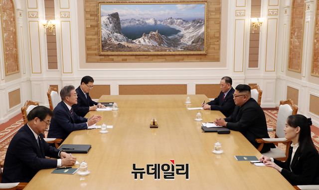 문재인 대통령이 18일 오후 평양 조선노동당 중앙위원회 본부 청사에서 김정은 국무위원장과 정상회담을 하고 있다. 앞줄 왼쪽부터 시계방향으로 서훈 국정원장, 문재인 대통령, 정의용 국가안보실장, 김영철 당중앙위 부위원장, 김정은 국무위원장, 김여정 당중앙위 제1부부장. (사진=평양사진공동취재단)