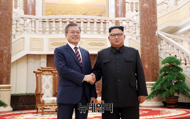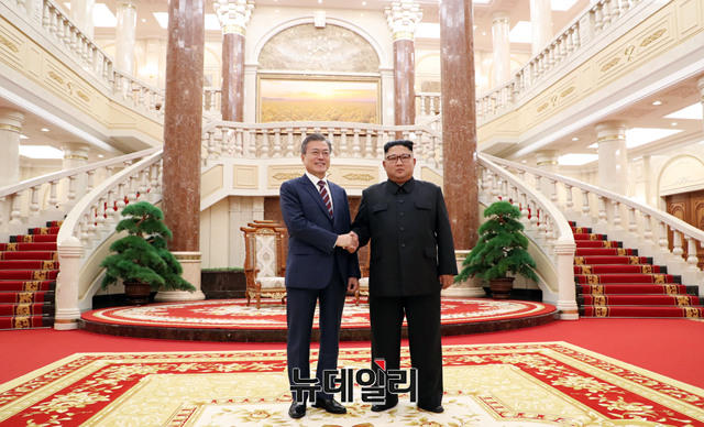 문재인 대통령이 18일 오후 평양 조선노동당 중앙위원회 본부 청사 로비에서 김정은 국무위원장과 정상회담 시작에 전 악수를 하고 있다. (사진=평양사진공동취재단)