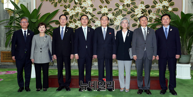 18일 오후 평양 중구역 만수대의사당에서 열린 평양남북정상회담 특별수행원-김영남 최고인민회의 상임위원장 면담에 앞서 김 상임위원장이 특별수행원들과 기념촬영하고 있다. 오른쪽부터 김영춘 해수부 장관, 도종환 문체부 장관, 강경화 외교부 장관, 김 상임위원장, 조명균 통일부 장관, 송영무 국방부 장관, 김현미 국토부 장관. (사진=평양사진공동취재단)