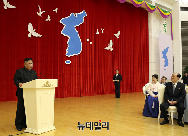 북한 김정은이 지난 18일 오후 평양 목란관에서 남북정상회담 환영 만찬사를 하고 있다. (사진=평양사진공동취재단)