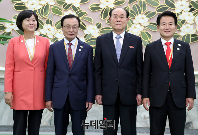 문재인 대통령의 남북정상회담 특별수행원 자격으로 평양을 찾은 여야 3당 대표가 19일 오전 평양 만수대의사당에서 북한 김영남과 면담에 앞서 기념촬영을 하고 있다. 왼쪽부터 이정미 정의당 대표, 이해찬 더불어민주당 대표, 김영남, 정동영 민주평화당. (사진=평양사진공동취재단)