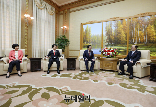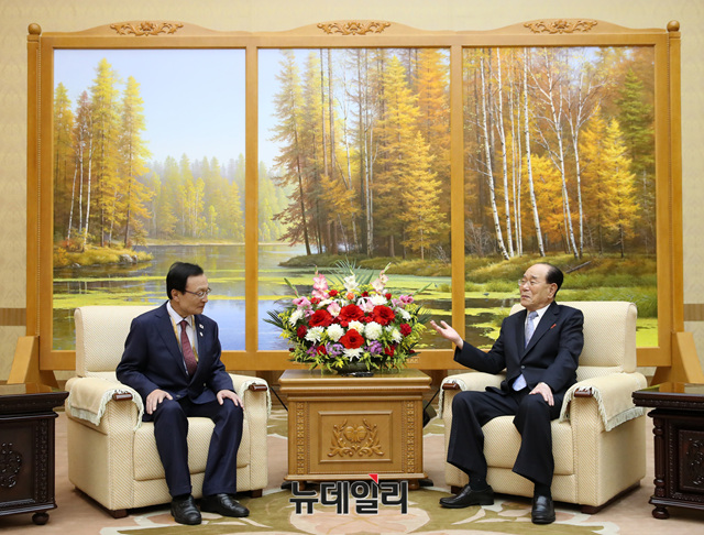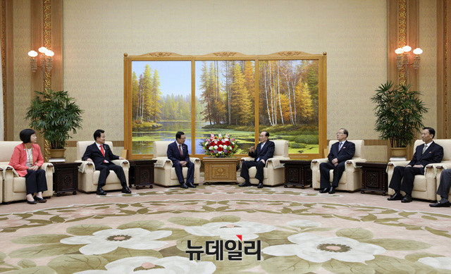 문재인 대통령의 남북정상회담 특별수행원 자격으로 평양을 찾은 여야 3당 대표가 19일 오전 평양 만수대의사당에서 북한 김영남과 면담을 하고 있다. (사진=평양사진공동취재단)