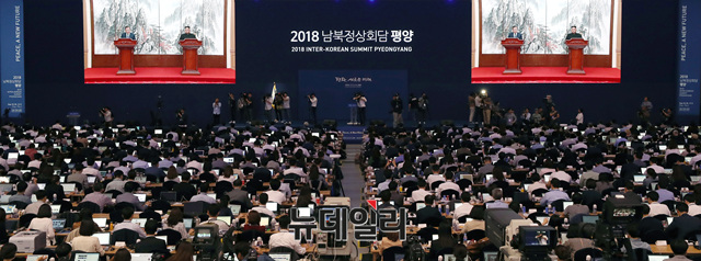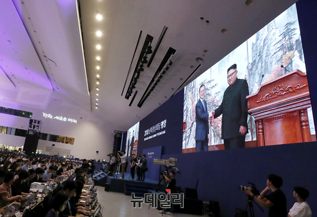 문재인 대통령과 북한 김정은의 남북정상 공동 기자회견이 19일 오전 서울 동대문구 '2018 남북정상회담 평양 서울프레스 센터'에서 생중계 되고 있다. (사진=평양사진공동취재단)