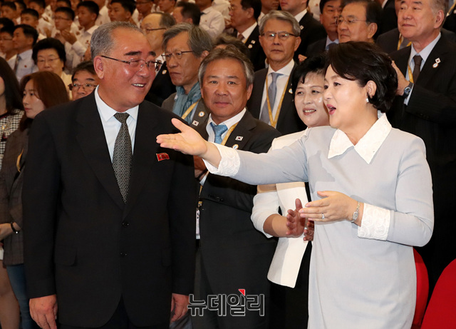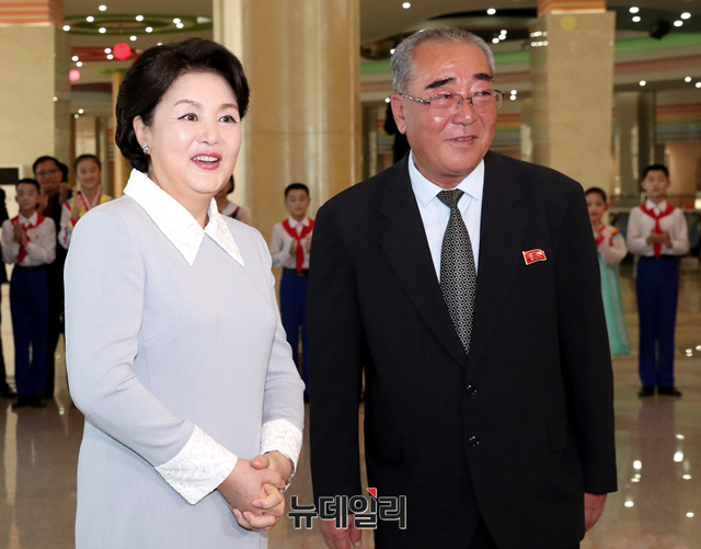 김정숙이 19일 오전 만경대 학생소년궁전을 방문해 렴윤학(왼쪽) 총장과 함께 학생들 공연을 관람을 마치고 이야기를 나누고 있다. (사진=평양사진공동취재단)