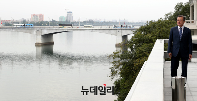 문재인 대통령이 19일 오전 평양 옥류관에서 열린 남북 정상 및 수행원 오찬에 앞서 옥류관 테라스에서 대동강을 바라보고 있다. (사진=평양사진공동취재단)