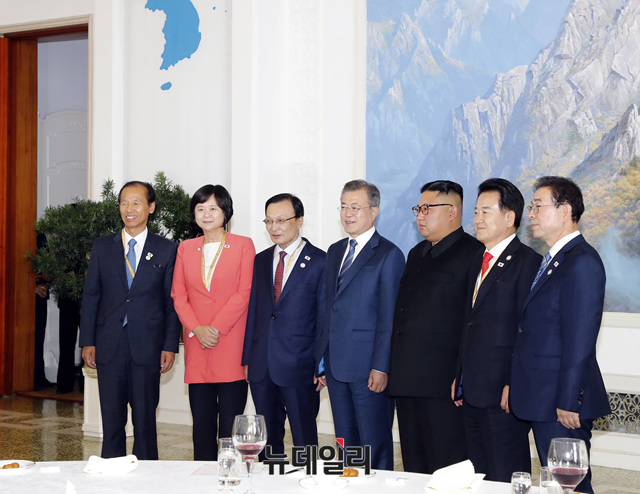 문재인 대통령과 북한 김정은이 19일 오후 평양 옥류관에서 열린 오찬을 마친 뒤 이해찬 더불어민주당 대표 등 특별 수행원들과 기념촬영을 하고 있다. 왼쪽부터 최문순 강원도 지사, 이정미 정의당 대표, 이 대표, 문 대통령, 김 위원장, 정동영 민주평화당 대표, 박원순 서울시장. (사진=평양사진공동취재단)