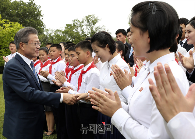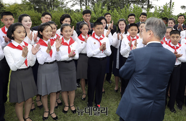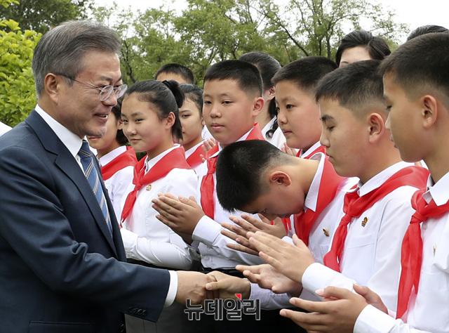 문재인 대통령이 19일 오후 남북정상회담 숙소로 사용한 평양 백화원초대소에 남쪽에서 가져온 10년생 모감주나무를 심은 뒤 행사에 참석한 북한 학생들과 인사하고 있다. (사진=평양사진공동취재단)