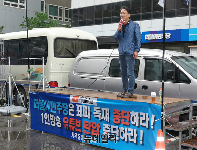 강민구 자유연대 조직국장이 20일 오전 여의도 더불어민주당 당사 앞에서 열린 '민주당 유튜브 탄압 규탄 집회'에 참석해 발언을 하고 있다.