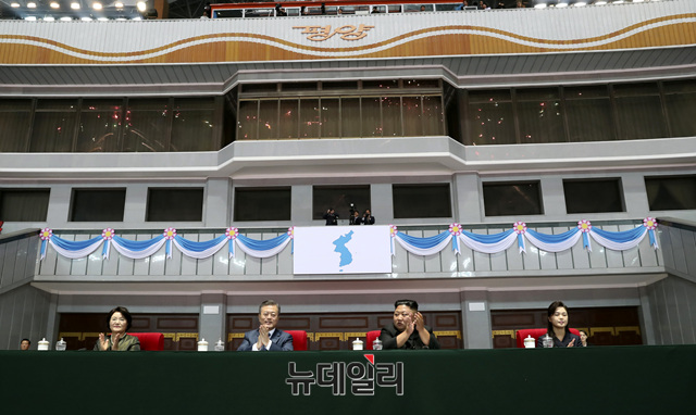 문재인 대통령과 북한 김정은이 지난 19일 밤 평양 5.1 경기장에서 열린 공연을 관람한 뒤 박수 보내고 있다. (사진=평양사진공동취재단)