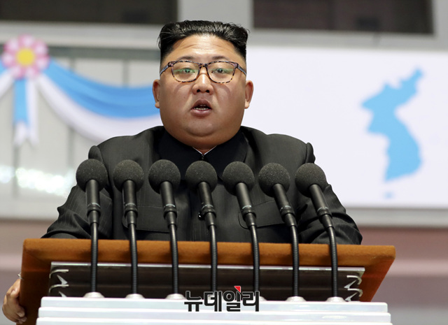 북한 김정은이 지난 19일 밤 평양 5.1 경기장에서 열린 공연을 관람한 뒤 평양 시민들앞에서 연설을 하고 있다. (사진=평양사진공동취재단)
