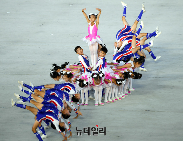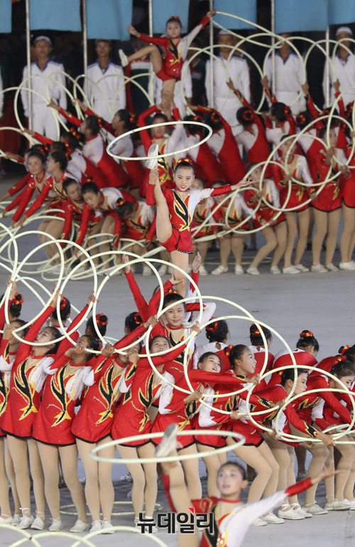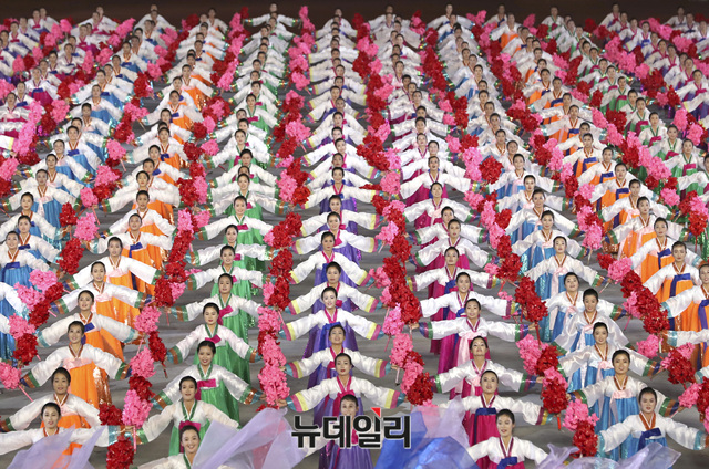 북한 공연단이 지난 19일 밤 평양 5.1 경기장에서 열린 '빛나는 조국' 공연을 선보이고 있다. (사진=평양사진공동취재단)