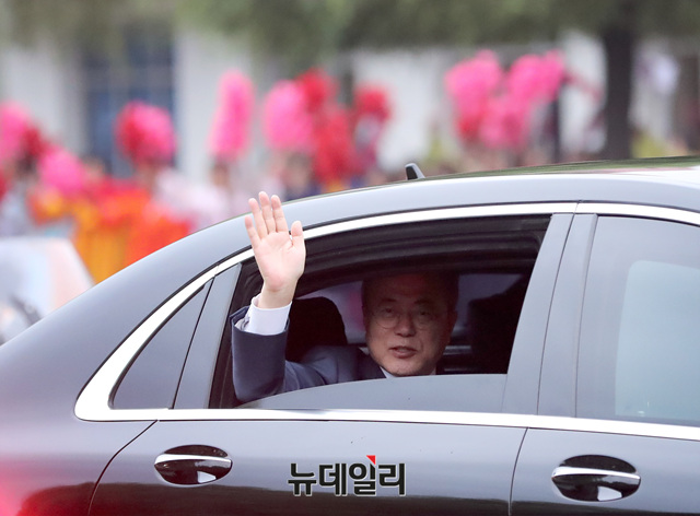 문재인 대통령과 부인 김정숙이 20일 오전 백두산으로 가기 위해 평양 순안공항으로 이동하고 있다. (사진=평양사진공동취재단)