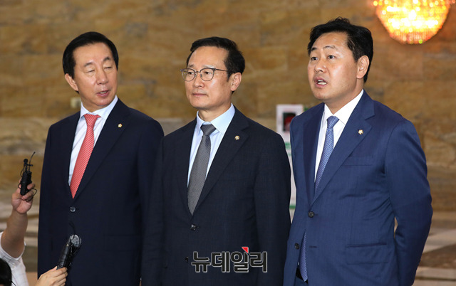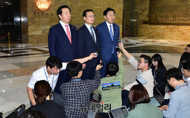 김성태 자유한국당 원내대표, 홍영표 더불어민주당 원내대표, 김관영 바른미래당 원내대표가 20일 오후 국회 로텐더홀에서 쟁점법안 합의 후 기자회견을 하고 있다.
