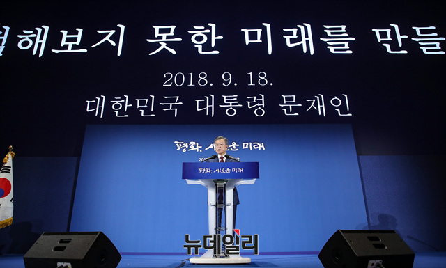 방북을 마친 문재인 대통령이 20일 오후 귀환 후 서울 동대문디자인플라자 내 프레스센터에서 가진 대국민 보고에서 취재진 질문에 답하고 있다. (사진=평양사진공동취재단)