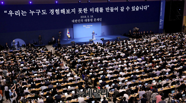 방북을 마친 문재인 대통령이 20일 오후 귀환 후 서울 동대문디자인플라자 내 프레스센터에서 가진 대국민 보고를 하고 있다. (사진=평양사진공동취재단)