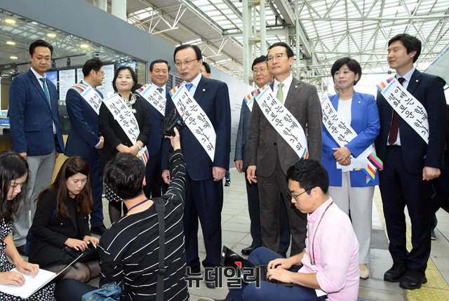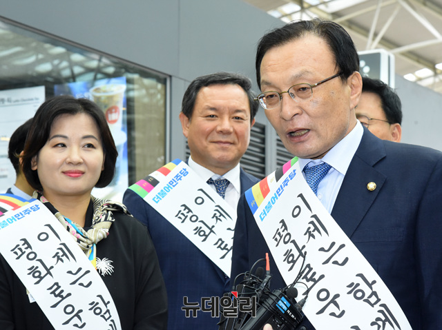 이해찬 더불어민주당 대표가 추석연휴를 앞둔 21일 오전 서울역에서 취재진들의 질문에 답하고 있다.
