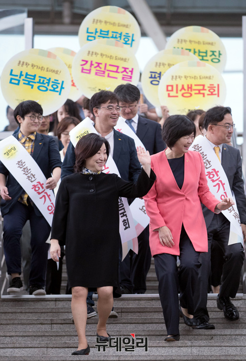 이정미 정의당 대표, 심상정 전 대표 등 지도부가 추석 연휴를 앞둔 21일 오전 서울역에서 귀성객들에게 인사하고 있다.