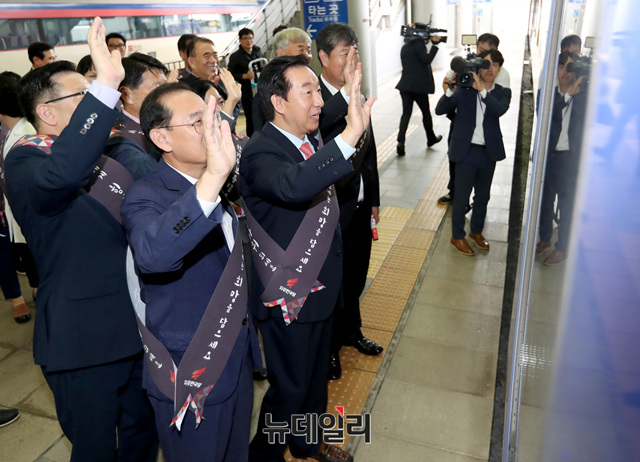 김성태 자유한국당 대표가 추석 연휴를 앞둔 21일 오전 서울역에서 귀성객을 향해 손을 흔들고 있다.