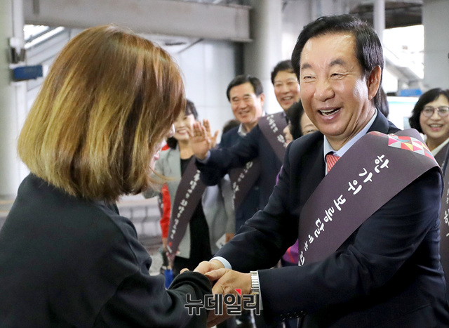 김성태 자유한국당 원내대표가 추석 연휴를 앞둔 21일 오전 서울역에서 귀성객과 악수를 나누고 있다.