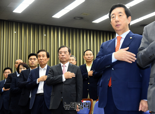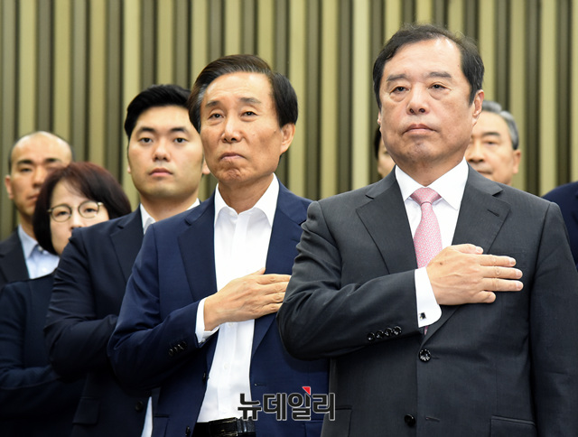 김병준 자유한국당 비상대책위원장, 김성태 원내대표 등 지도부들이 27일 오전 국회에서 열린 긴급 의원총회에 참석해 국민의례를 하고 있다.