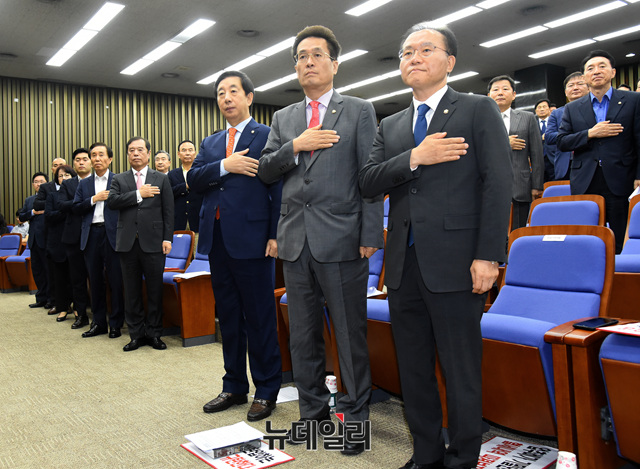 [포토] 긴급 의원총회, 국민의례 하는 자유한국당