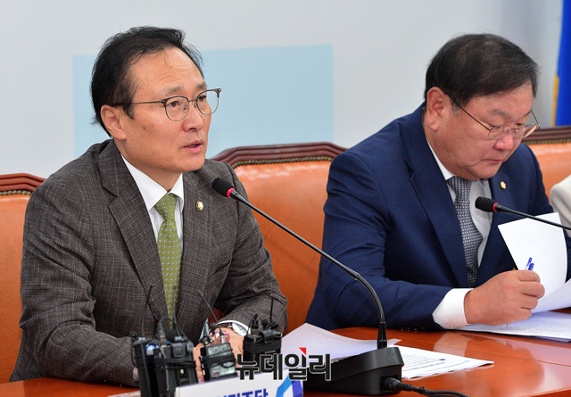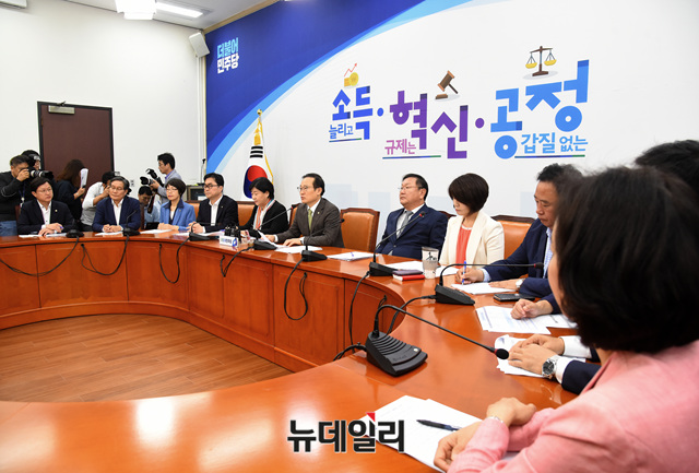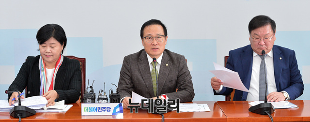 홍영표 더불어민주당 원내대표가 27일 오전 국회에서 열린 정책조정회의에 참석해 발언하고 있다.
