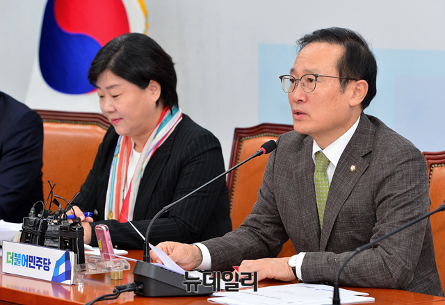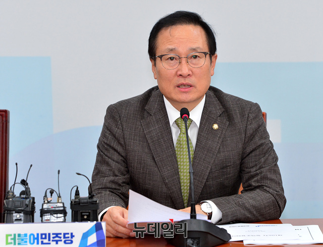 홍영표 더불어민주당 원내대표가 27일 오전 국회에서 열린 정책조정회의에 참석해 모두발언 하고 있다.
