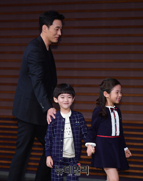 배우 소지섭이 27일 오후 서울 마포구 상암MBC에서 열린 수목미니시리즈 '내 뒤에 테리우스(극본 오지영, 연출 박상훈 박상우)' 제작발표회에서 아역배우 옥예린, 김건우와 함께 입장하고 있다. '내 뒤에 테리우스'는 27일 밤 10시 첫 방송 된다.