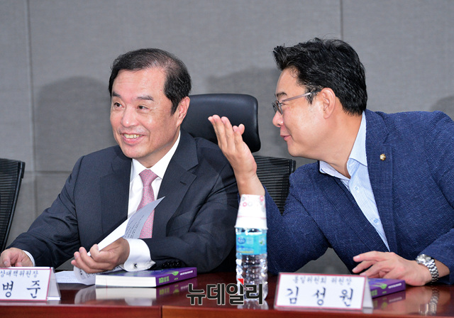 김병준 자유한국당 비상대책위원장과 김성원 의원이 27일 오후 국회 의원회관에서 열린 '통일위원회 세미나'에 참석해 대화를 나누고 있다.